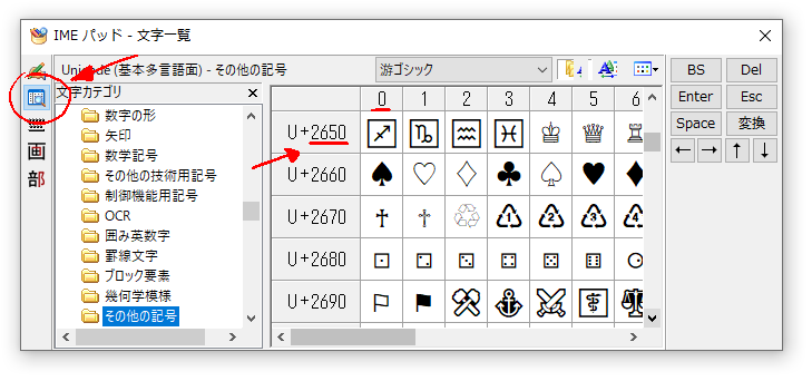 表示方法は、標準でタスクバーに表示されている(はず)の「A」または「あ」を右クリックし、メニューから「IMEパッド」を選び、開いたIMEパッドの左端にあるアイコンで「文字一覧」を選択。